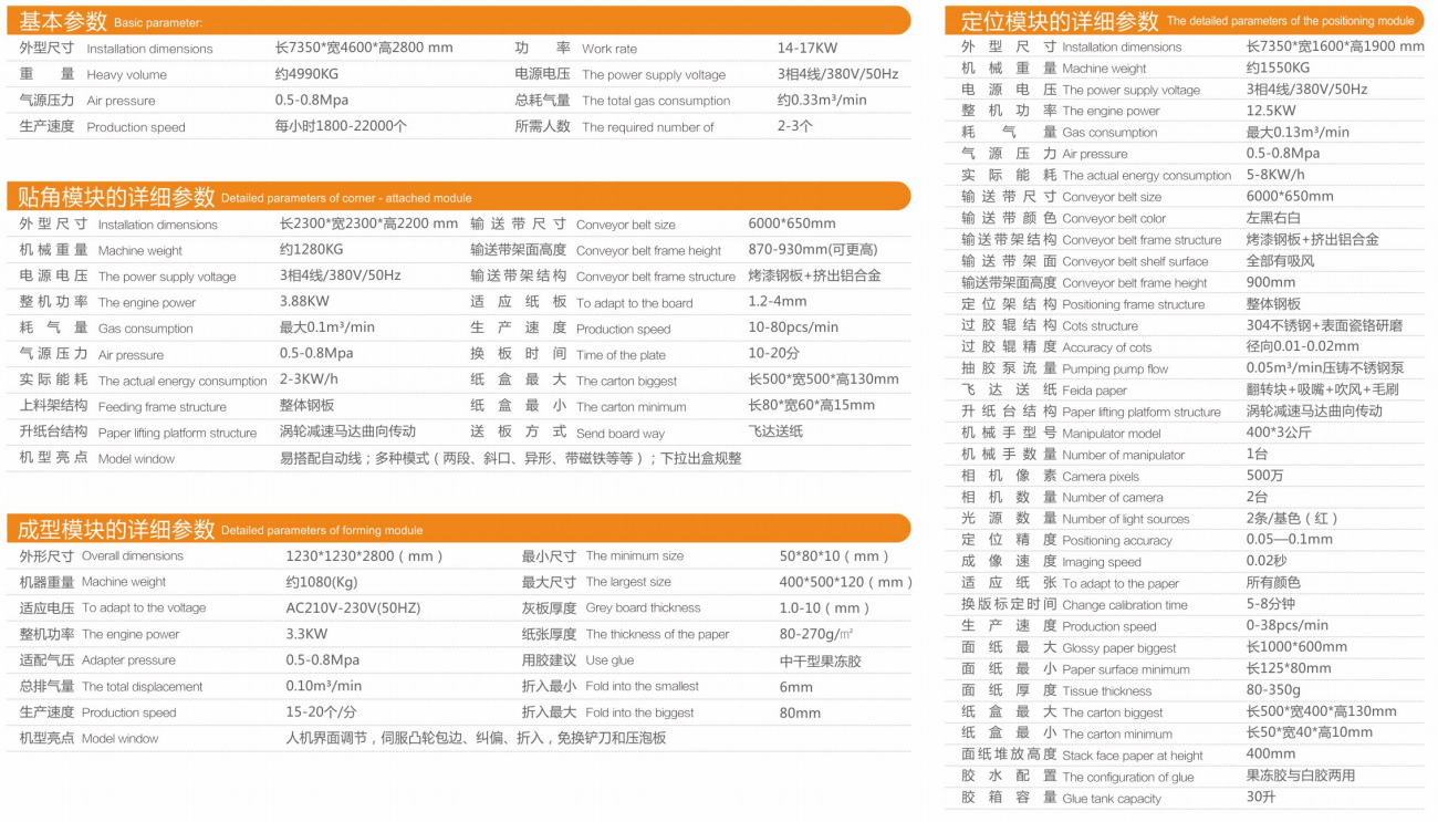 The machine is mainly divided into three parts: positioning module, angle sticking module and forming module. It can realize automatic paper feeding, automatic glue passing, automatic angle sticking, automatic positioning, automatic forming and automatic bubble pressing in the production of all kinds of cartons, wooden boxes and plastic boxes. A series of technological processes can be completed automatically, the plate can be transferred quickly, and the box body can be made exquisitely I'm not. Non adhesive tape slot and double lift paper table of corner module. The intelligent adjustment, automatic locking, servo cam action, no change blade and pressure foam board of the molding module are designed and produced by our company, and have obtained a number of national patents.