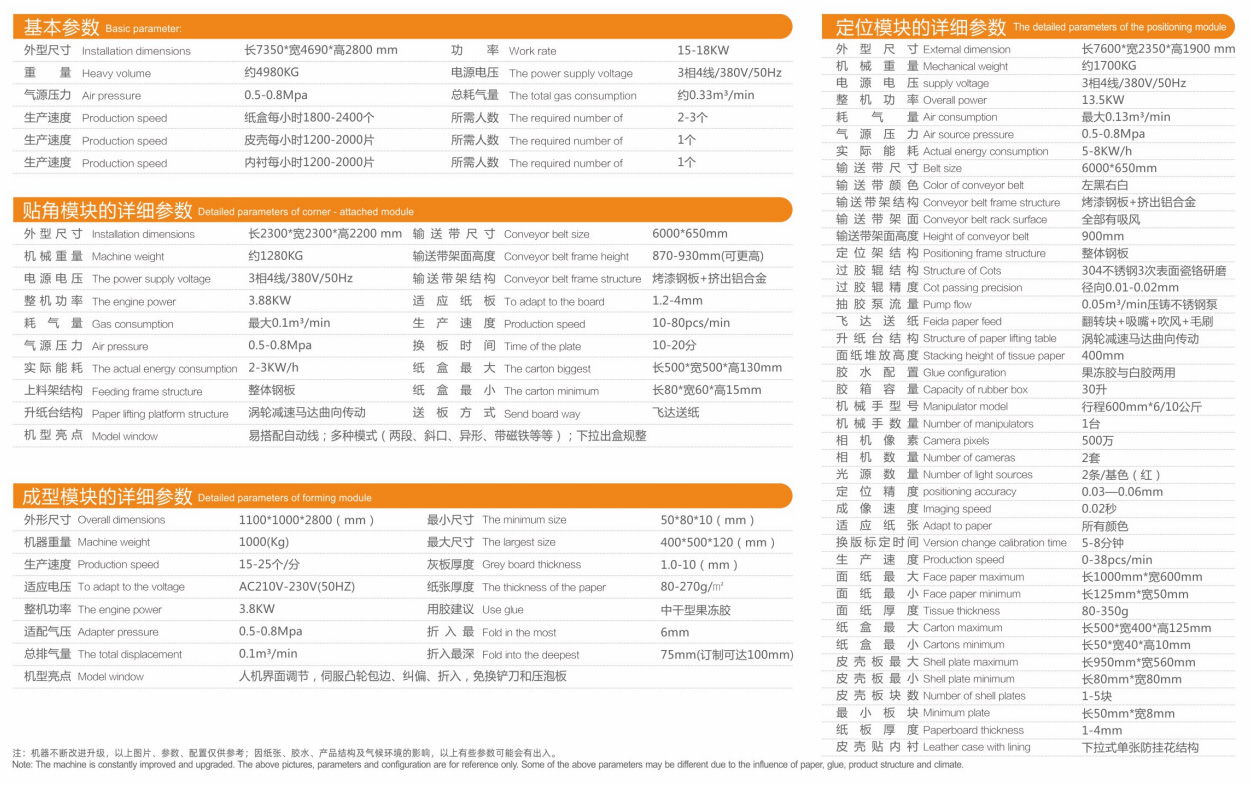 該機主要分為定位模塊、貼角模塊和成型模塊三大部分,可實現(xiàn)各類紙盒、木盒、膠盒生產(chǎn)時的自動送紙、自動過膠、自動貼角、自動定位、自動成型和自動壓泡等,系列工藝工序的自動完成,轉(zhuǎn)版速度快,制作盒體精美。定位模塊的黑白皮帶、雙鏡頭、自動糾偏、皮殼板貼襯定位、五片板定位。貼角模塊的不粘膠膠帶槽、雙升紙臺。成型模塊的智能調(diào)節(jié)、自動鎖固、伺服凸輪動作、免換鏟刀和壓泡板等,均由我司自行研發(fā)設(shè)計生產(chǎn),并獲得多項國家專利。